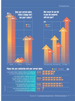 Respondents reported mixed opinions about business performance. More than 45.3% reported that business increased in 2017 compared to 2016 (3). The number reporting a drop in business activity rose slightly, and the number of companies hiring new workers dropped slightly from 27.5% in 2016 to 25% in 2017. The number of respondents who felt “more secure” in their positions in 2017 rose to 22.6% versus 18.6% in 2016 (2); however, more respondents said they felt less secure in 2017 (33.6%) compared with 25.4% in 2016 (