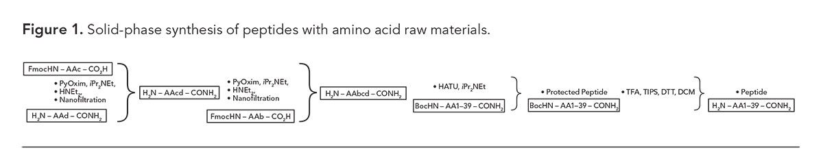 There are more than 60 peptide therapeutics approved around the world and hundreds currently in clinical studies (1). A peptide is a polymer consisting of less than 100 amino acids (AA) linked by an amide or peptide bond. These therapeutics are desirable as they exhibit low toxicity and high biological activity. The two major peptide manufacturing pathways consist of recombinant and synthetic. Recombinant manufacturing uses an engineered living microorganism, such as Escherichia coli (E. coli), to synthesize the peptide. Synthetic peptide manufacturing originated with solution-phase peptide synthesis to groundbreaking solid-phase peptide synthesis (SPPS) and hybrid methods (2). Further advances in the SPPS technology improved the deprotection and cleavage steps (see Figure 1), resulting in the ability to safely manufacture synthetic peptides for personalized medicine to commercial manufacturing of greater than 100 kilograms (3).