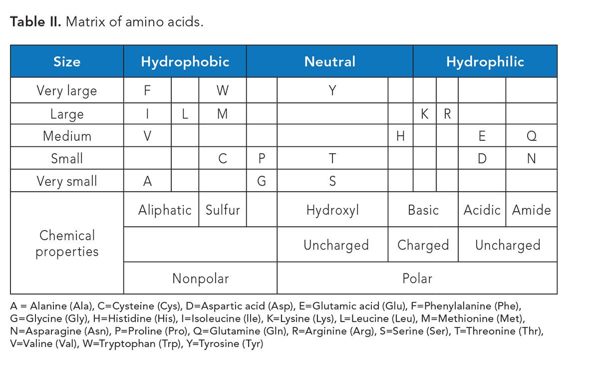 Organic solvents are commonly used in the manufacture of peptide therapeutics but can present operational, safety, and environmental concerns with their use in cleaning commercial manufacturing equipment. The building blocks of peptides, 20 different amino acids, can vary in size, polarity, pH, and other factors included in Table II. The larger molecular weight amino acids are hydrophobic in nature, reducing the solubility in water. Other factors that affect solubility include the number of amino acids present, negative (acidic) or positive (basic) charge, pH, and temperature of the solution. The cleaning method, such as sonication, can also affect solubility. Laboratory testing evaluating the solubility of the peptide in water and/or cleaning agent may provide helpful information on cleaning as well as rinse and swab analysis.