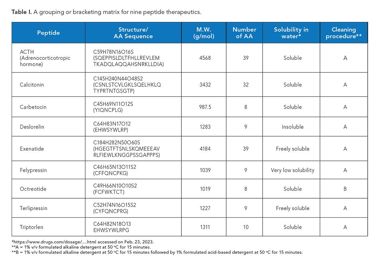 Table I provides a grouping or bracketing matrix of nine peptide therapeutics that range in molecular weight from 987.5 to 4568 g/mol along with their solubility in water and cleaning procedures. Eight of the nine peptides were easily cleaned with 1% v/v formulated alkaline detergent at 50 oC for 15 minutes (cleaning procedure A), and one peptide required a second cleaning step using 1% v/v formulated acid detergent at 50 oC for 15 minutes (cleaning procedure B). In this example, cleaning procedure B was selected for all nine peptides, and a second formulated chlorinated alkaline wash was added to ensure degradation of the peptides. With the grouping strategy, a single cleaning procedure for all the products was implemented. The addition of the acid wash also eliminates the requirement for wastewater neutralization, reduces bioburden, and provides continual maintenance of the stainless-steel equipment (12).