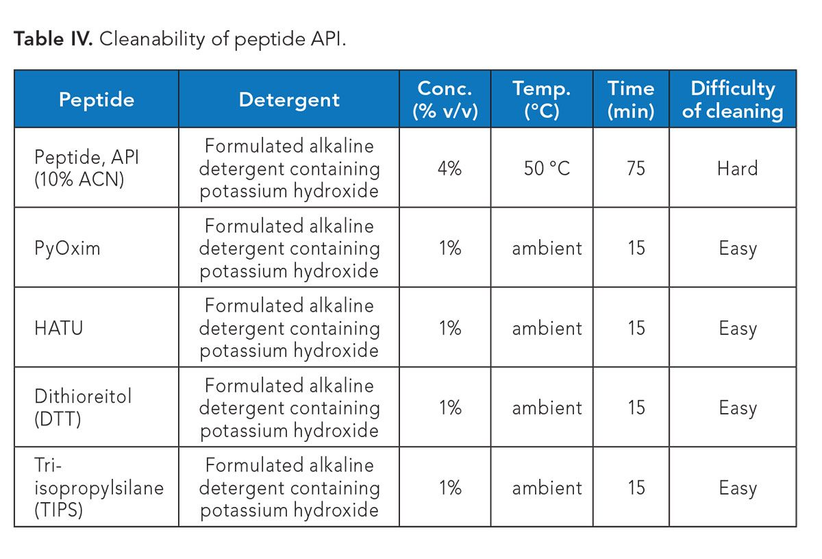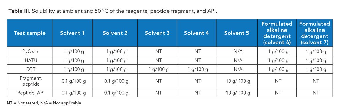 While other solvents in the manufacturing process show good solubility, aqueous detergents may clean at lower temperatures and concentrations. Optimizing this cleaning process reduces the risk of cross-contamination and saves the manufacturer cleaning time and overall costs. Specific parameters for solubility of the new peptide and reagents within the peptide manufacturing process can be explored through laboratory studies (see Table III).