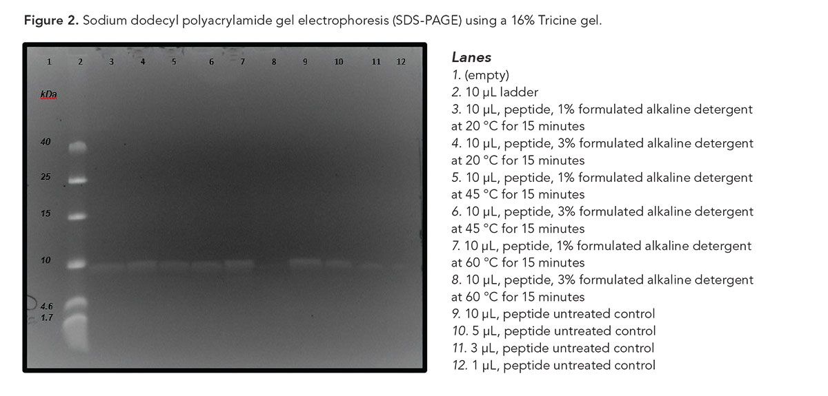 In Figure 2, the peptide control was shown in lane 9 with decreasing concentrations through lane 12. The distinct band is seen at 10 kDa, while the treated samples show banding that can be compared to the control band’s intensity. The treatments with the detergent up to a 1% v/v concentration at 60 °C for 15 minutes saw no differences in the degradation of the peptide versus the untreated controls. This peptide saw degradation at 3% v/v formulated alkaline detergent at 60 °C for 15 minutes. Additional testing at different concentrations, temperatures, and exposure times can be performed to optimize performance.
