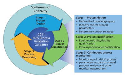 In Part III, the control strategy for the process was developed from a design space established from characterization studies. As the process-qualification stage proceeds, the continuum of criticality was used to develop equipment qualification criteria and strategies for process performance qualification. Finally, in the continued-process-verification stage of process validation, criticality was used to determine the frequency of monitoring and analysis.