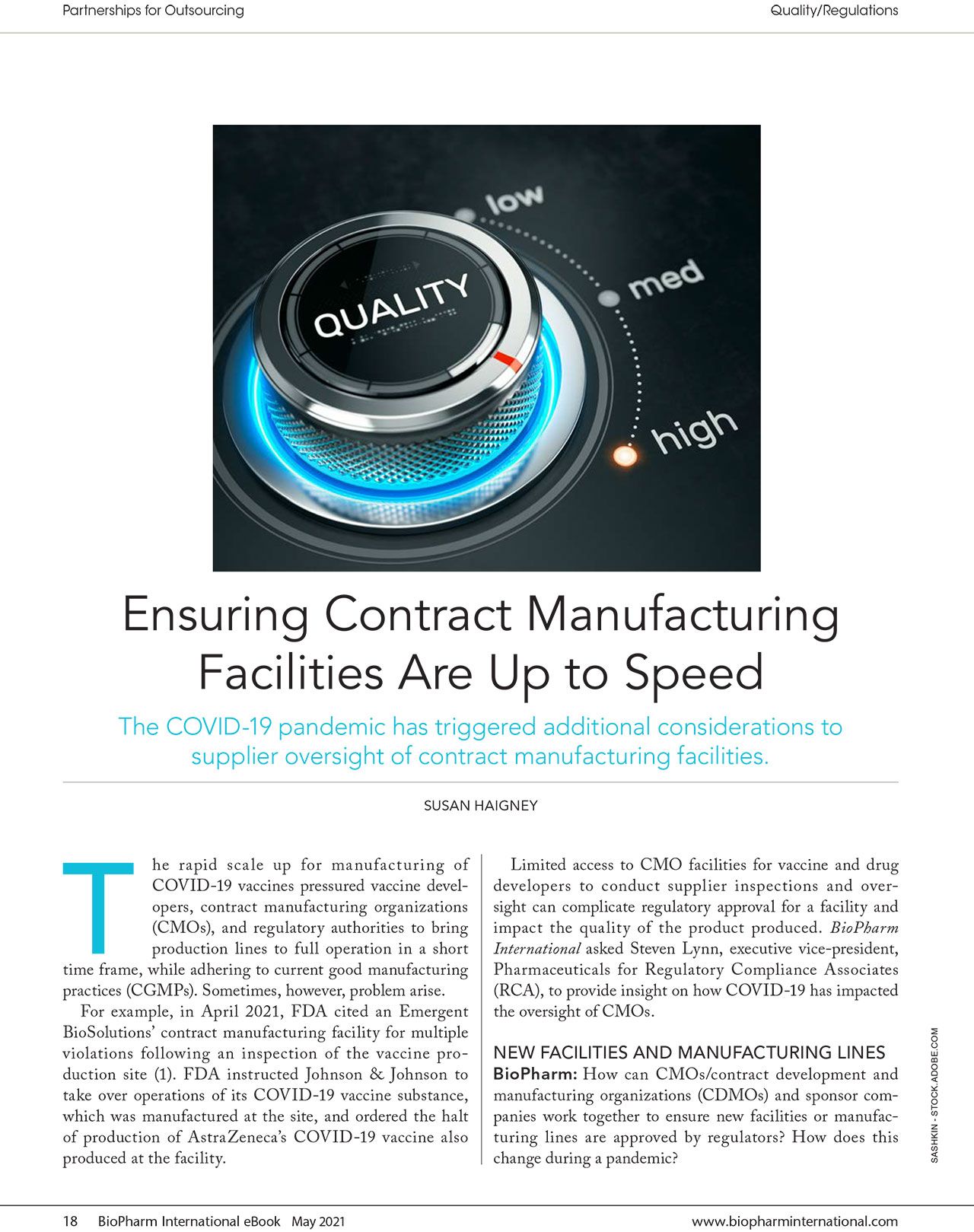 When referring to this article, please cite it as S. Haigney, “Ensuring Contract Manufacturing Facilities Are Up to Speed," BioPharm International Partnerships for Outsourcing eBook (May 2021).