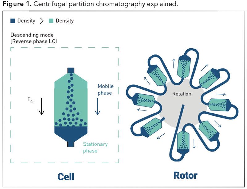 In contrast to conventional solid–liquid chromatographic techniques, CPC consists of liquid stationary and mobile phases. The stationary phase is held in place by a strong centrifugal force inside the column, while the mobile phase is pumped through it. The partitioning of the solutes between the two immiscible phases governs purification and affects the time spent within the stationary phase, which determines solute retention (see Figure 1).
