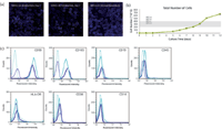 Figure 5: (a) Human mesenchymal stem cells (hMSCs) not only proliferated on initial seeded microcarriers but also colonized empty microcarriers; (b) hMSCs expanded quickly in the bioreactor and reached maximum cell number (~600 million cells) in 12 d. The grey bar represents the expected cell number from a 10-Stack CellSTACK in 14 d; (C) No difference in cell surface antigen expression between hMSCs expanded in CellSTACK and a bioreactor with microcarriers (dotted line: isotype control; dark blue line: bioreactor; light blue line: CellSTACK).