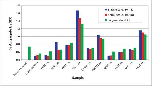 Figure 2: The effect of small-scale controlled freeze-thaw process parameters (e.g., rate of freezing and thawing, number of cycles) and scaling (simulated small-scale controlled freeze-thaw vs. largescale uncontrolled freeze-thaw process) on aggregation (% soluble aggregate by size-exclusion chromatography [SEC]) of mAb-A. FF: fast freeze; MF: medium freeze; SF: slow freeze; FT: fast thaw; MT: medium thaw; ST: slow thaw. *The frozen control was exposed to one MF/MT cycle with extended storage at -80ËC.