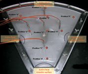 Figure 1. Sample ports and positions on the Cryowedge showing the placement of thermocouples that monitor the temperature changes at the respective positions during the freezing and thawing process. The active heat transfer surfaces are identified; these comprise the full top and bottom edges, as well as the dotted regions on the left and right hand edges.