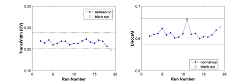 Figure 4. TransWidth and DirectAf trends for ion exchange chromatography column runs including the blank run. The dash lines represent the acceptance criteria based on Equation 3. CV is column volume.