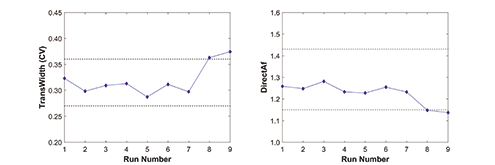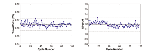 DTA was used to support chromatography resin lifetime process validation (PV). TransWidth and DirectAf were chosen as lifetime indicators of the resin bed integrity. Both metrics were calculated for each column cycle and monitored throughout its intended use period. Figure 5 shows TransWidth and DirectAf trends through the resin lifetime PV for an affinity chromatography column. It can be seen that the TransWidth and DirectAf remain consistent among cycles.
