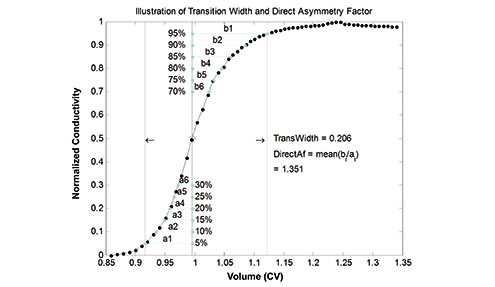 Corresponding to HETP and Af in the moment analysis, two metrics from DTA, TransWidth and DirectAf, were extracted directly from the transition curve of post-column conductivity versus CV without extensive signal processing. TransWidth is a direct measure of band broadening of the column, while DirectAf is a direct measure of asymmetry. As a pre-requisite, moment analysis requires a time stamp at the beginning of buffer change. In real-world application, it can be difficult, depending on data historian setup, for the chromatography skid. DTA, however, does not need the precise timing of buffer change. A detailed calculation procedure (illustrated in Figure 2) is shown below: