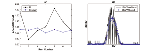 where Vmax is the value of V corresponding to (dC/dV)max, and Vbi and Vai are the value of V at x% of (dC/dV)max, Vbi > Vai. While single threshold of 10% (n=1 and x=10) was commonly used for moment analysis (e.g., Larson et al.’s work [7]), multiple thresholds (n=6 and x=10, 20, 30, 40, 50, and 70) were implemented on the noisy manufacturing process data shown in this paper in order to mitigate the risk of single-point failure.