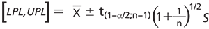 where LPL and UPL are the lower and upper prediction limits, respectively, xË is the sample mean, s is the sample standard deviation, n is the sample size, and t(1α/2;n-1) is the two-sided t-distribution statistic with n-1 degrees of freedom (α=0.05).