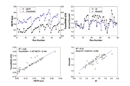 To further check the relationship between the two sets of metrics, correlations were performed as shown in Figure 3. Results indicate there are strong linear correlations between HETP and TransWidth (coefficient of determination R2=0.88), and between Af and DirectAf (R2=0.75). Therefore, TransWidth and DirectAf could be good substitutes for HETP and Af.