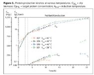 The results of the parallel approach are illustrated in Figure 1. All four of the parallel fermenters used identical medium and feeding profiles. Compared to an induction temperature of 42 °C, these results showed that the product expression phase could be slightly prolonged at 40 °C. By further reducing the induction temperature to 38 °C, target protein formation was sustained with the same high expression yield during the entire process, thus significantly improving the product titer to 4.5 g/L.