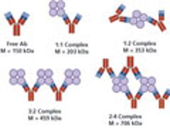 A study to investigate metacomplex formation in the hetero-association of a multivalent antigen, streptavidin (SA), and a bivalent antibody (Ab) using a composition-gradient multiangle light-scattering (CG-MALS) system consisting of a composition-gradient device, a MALS detector, and a UV/Vis absorption detector.