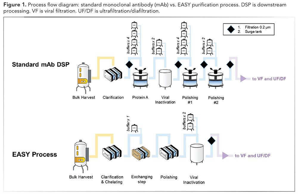 CLICK FIGURE TO ENLARGE. Figure 1. Process flow diagram: standard monoclonal antibody (mAb) vs. EASY purification process. DSP is downstream processing. VF is viral filtration. UF/DF is ultrafiltration/diafiltration.