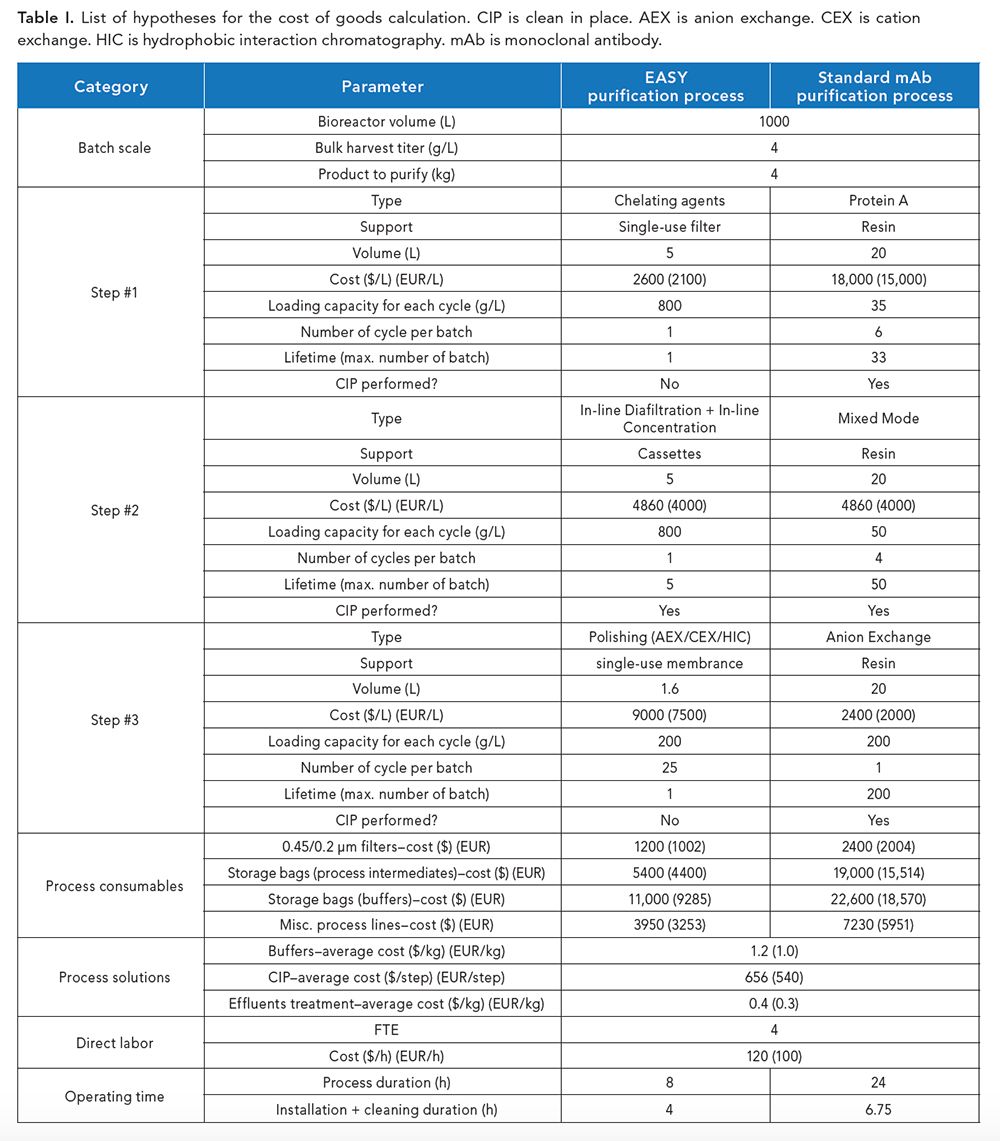 CLICK FIGURE TO ENLARGE. Table I. List of hypotheses for the cost of goods calculation. CIP is clean in place. AEX is anion exchange. CEX is cation exchange. HIC is hydrophobic interaction chromatography. mAb is monoclonal antibody.