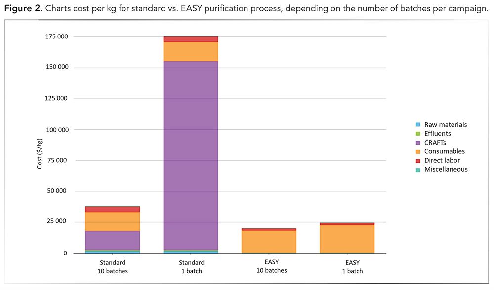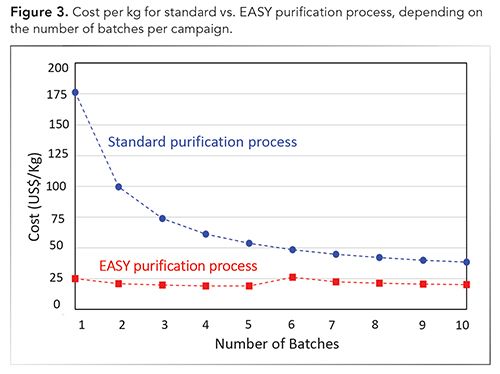 CLICK FIGURE TO ENLARGE. Figure 2. Charts cost per kg for standard vs. EASY purification process, depending on the number of batches per campaign.
