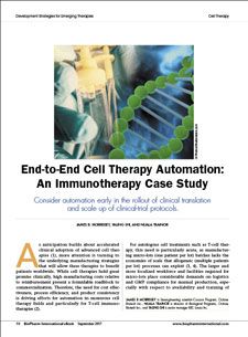 When referring to this article, please cite it as J. Morrissey, N. Trainor, and Y. Shi, "End-to-End Cell Therapy Automation: An Immunotherapy Case Study," BioPharm International Development Strategies for Emerging Therapies eBook (September 2017).