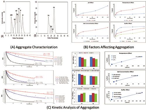 Modeling the kinetics and thermodynamics of protein aggregation can prove valuable in understanding its mechanism (9). Mathematical modeling of protein aggregation correlated along with kinetic data can help developers gain both qualitative and quantitative insights into the mechanism behind aggregation. Armed with this knowledge, developers can better predict and control aggregation by optimizing timeframes and environmental conditions (10).