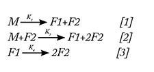 The concentration of F1 species increases in the beginning and then decreases (7). The concentration of F2 species continuously increases throughout the study. On examining these observations, the following mechanism is proposed: