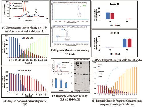 MATLAB R2015b was used to analyze fragmentation data obtained by SE–HPLC, which was then fitted into the proposed model equations to obtain the rate constants (Figure 2F). For all the fragment species, the R2 value was found to be greater than 0.9, proving that the model is statistically significant (7).