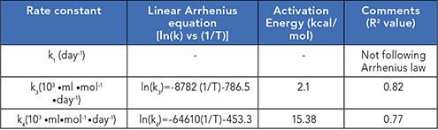 Table II: R2 value of the fit of linearized Arrhenius plot of ln(k) vs (1/T). The table includes the activation energy values as well as the fit equations.