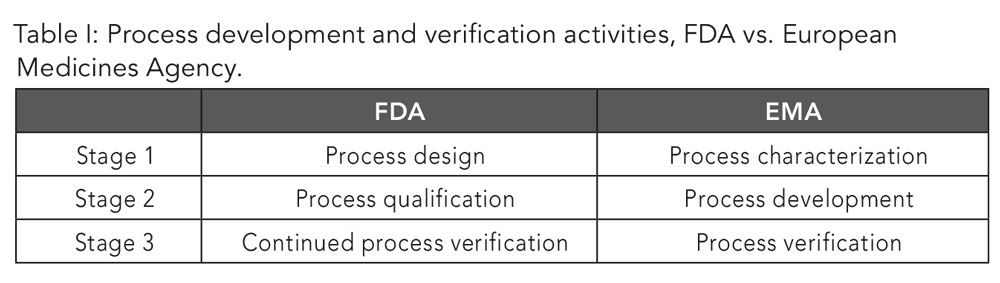 Table I: Process development and verification activities, FDA vs. European Medicines Agency.